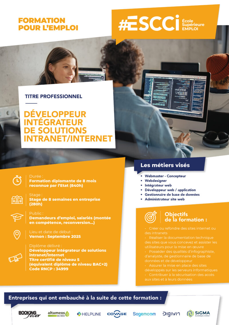 Le référentiel du diplôme « Développeur intégrateur de solutions intranet/internet» est composé de 4 blocs de compétences et de la prise en compte d’une période pratique en environnement professionnel. Le diplôme peut être obtenu en formation continue, initiale et par la VAE (Validation des Acquis de l’Expérience) :