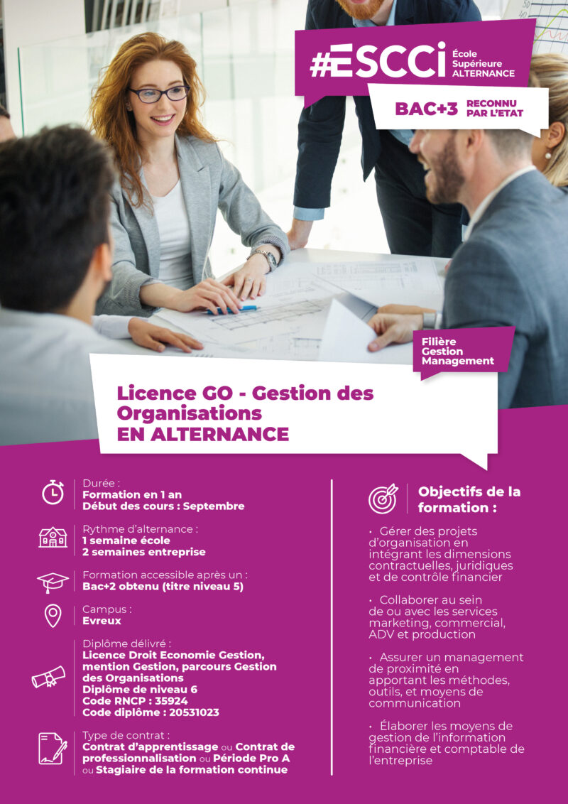 Après la licence gestion des organisations, l’ESCCI propose différentes poursuites de parcours sur un niveau supérieur (selon les conditions de passerelle et d’admissibilité définies par l’établissement).
